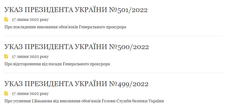 Указом №499 від виконання обов'зяків усунуто голову Служби безпеки України Івана Баканова.