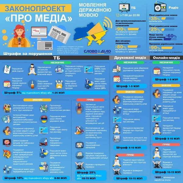 5. Проєкт передбачає для медіа штраф до десяти тисяч неоподатковуваних мінімумів доходів. Є й менші штрафи, а також платні реєстрація та внесення змін у реєстрі. Чим викликані такі великі штрафи у порівнянні з іншими адміністративними порушеннями? На жаль, в Україні штраф може стати інструментом тиску на медіа, особливо локальні та невеликі. В результаті замість захисту ми отримаємо цілу низку інструментів регуляції.
