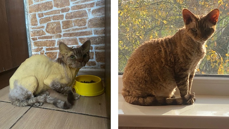 Через деякий час Кіт став більш активним: довше грався, менше спав. А ще десь через пару тижнів, після вироку лікарів, я помітила, що він не такий вже й жовтий – тіло стало нормального кольору, хоча ще й був лисий. Й ближче до березня він почав обростати хутром. А до літа це знову було саме те космічне створіння з фото: густе кучеряве коричневе з зеленими очима маленькою мордочкою та великими вухами. Про хвіст я вже розповіла – ним Кіт "говорить".