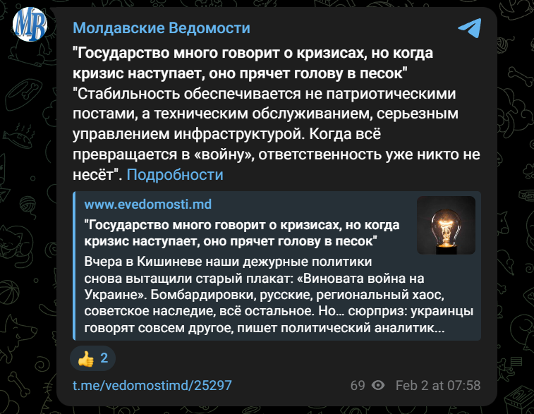 The Vedomosti Moldova channel, which positions itself as a news aggregator, operates in a similar way. It publishes short, dry facts about the shutdown without explaining the reasons or context. Such a presentation legitimizes the population's discontent, because when the media writes about power outages but is silent about the war, the average citizen perceives it as arbitrariness of local electricians.