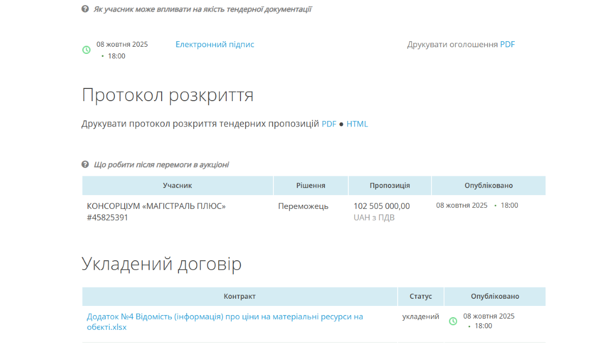 The contract for the works was concluded without an auction with the Magistral Plus consortium, and the expected value of the deal was UAH 102.5 million.