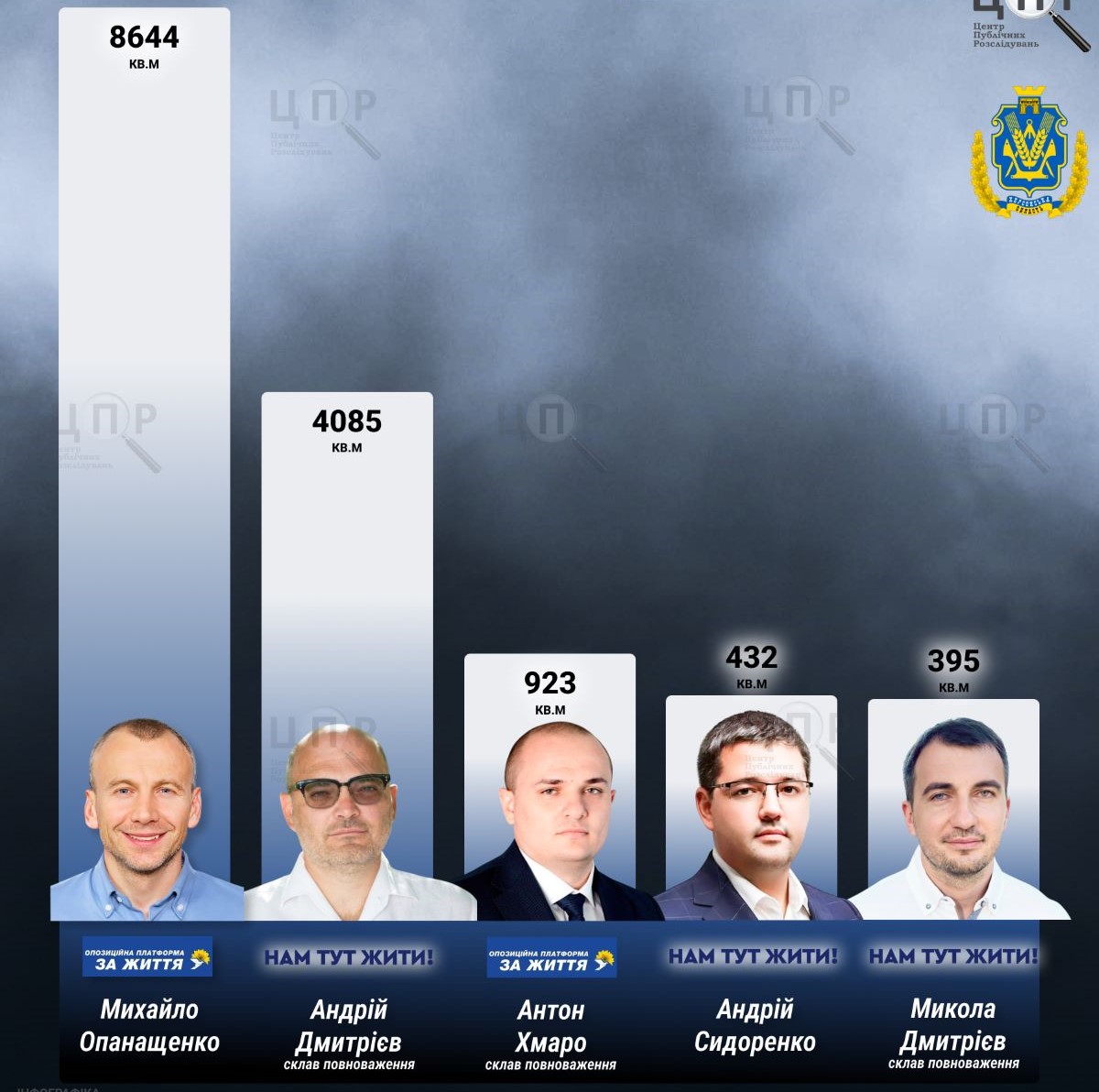 Mykhailo Opanashchenko of the OPFL has the most non-residential real estate - 8,644 square meters. He owns a production complex with an area of 1,512 square meters, and his wife owns two non-residential building complexes with a total area of 7,131 square meters.