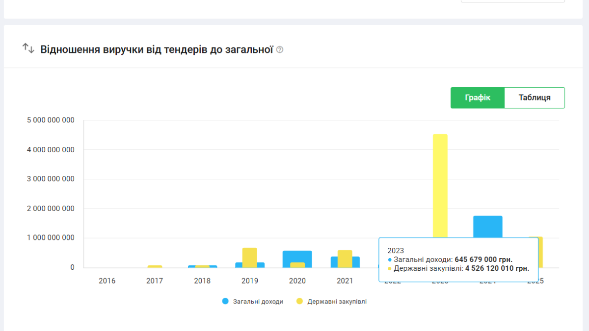 Analysts estimate that since 2017, the firm has received more than UAH 8 billion from public procurement, with the largest volumes in 2023, when the amount exceeded UAH 4.5 billion.