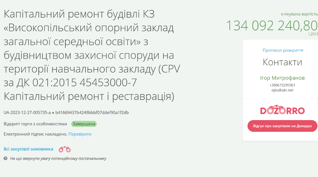 However, the school had previously ordered the construction of the shelter and reconstruction with another company, Global Build Engineering, which is also associated with Kherson Regional Military Administration Deputy Director Anton Samoilenko. In December 2023, a tender was announced, and an agreement with the company was signed for more than UAH 134 million in early 2024. In March 2025, the agreement was amended to state that the company should receive more than UAH 50 million in 2026.