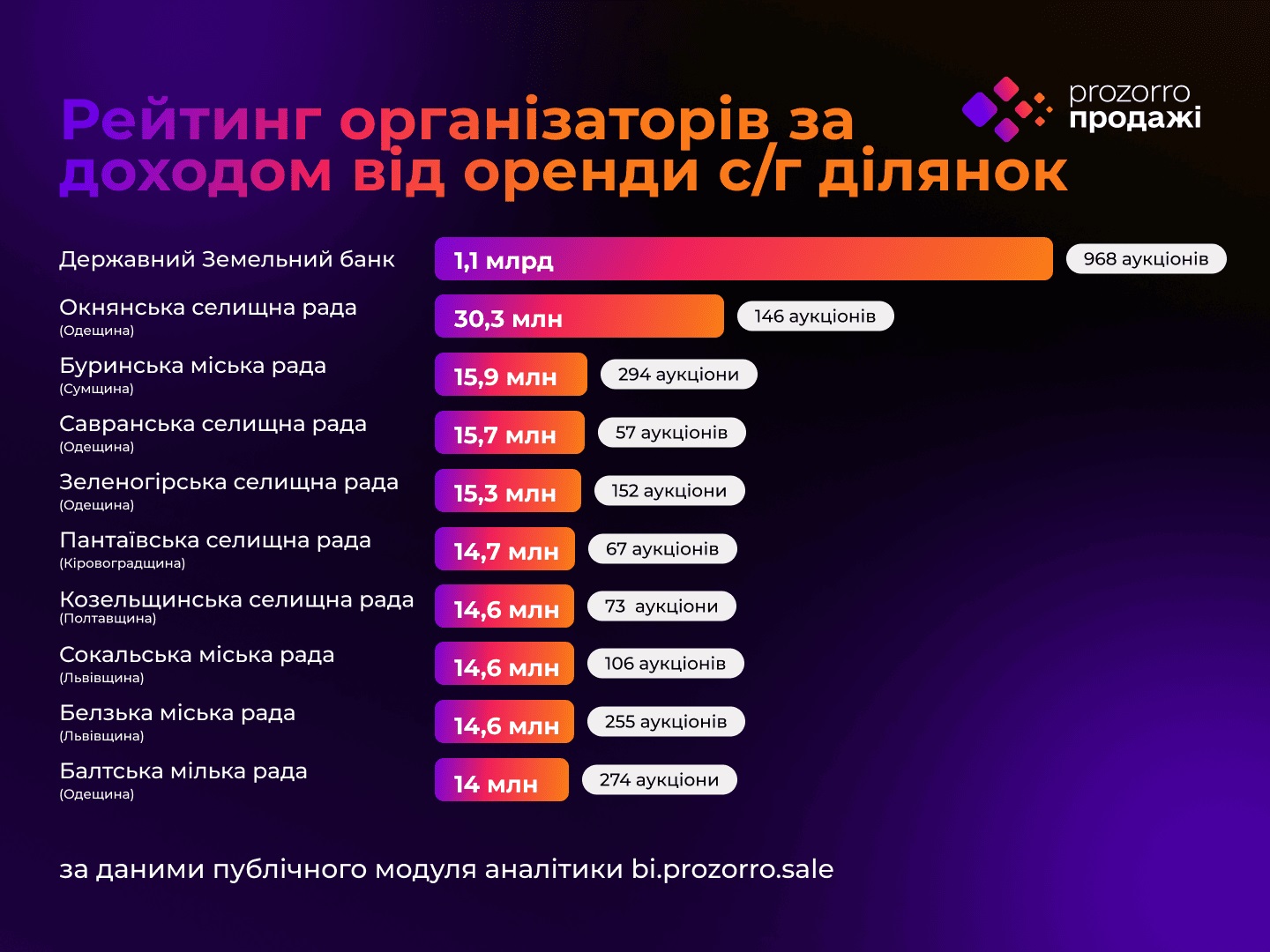 Among these four, the Baltska urban community has the lowest income - UAH 14 million, although it held 274 auctions. The community ranks tenth in the top ten. Oknyanska took the second place, Savranska - the fourth, and Zelenohirska - the fifth.