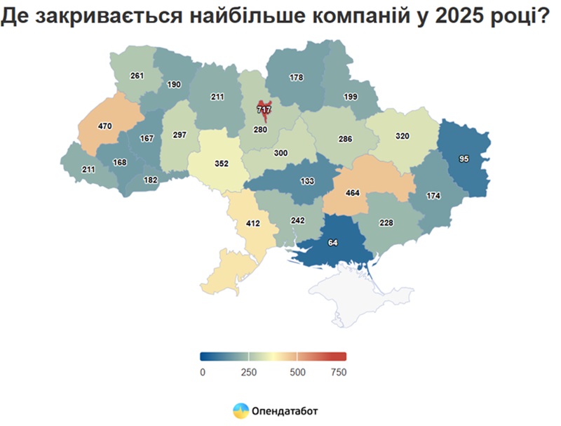At the same time, the majority of closures are in the same regions. Kyiv is the leader with 717 companies. It is followed by Lviv region with 470 companies and Dnipropetrovs'k region with 464 companies. Odesa region ranks fourth in terms of closed companies - 412 companies, Mykolaiv region - 242, and Kherson region - 64.