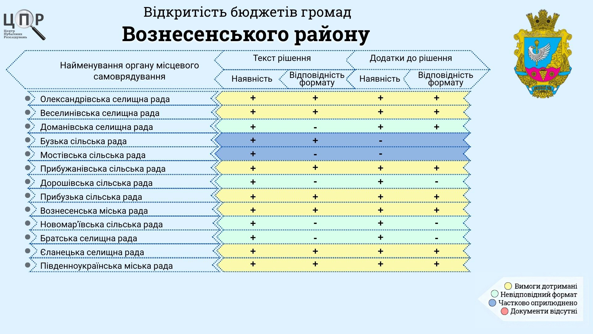 Seven communities in Voznesensk district showed the highest level of openness of documents: Oleksandrivka, Veselynivka, Prybuzhanivka, Prybuzka, Yelanets, Pivdenoukrayinsk and Voznesensk councils were distinguished.