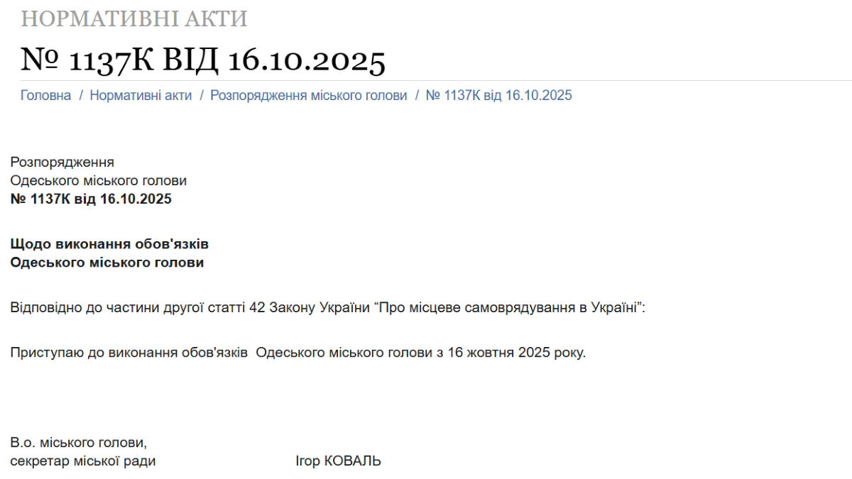 It was announced in Odesa that on October 16, 2025, the Secretary of the City Council, Ihor Koval, officially assumed the duties of the Mayor of Odesa. The relevant order No. 1137K was issued in accordance with part two of Article 42 of the Law of Ukraine "On Local Self-Government in Ukraine".