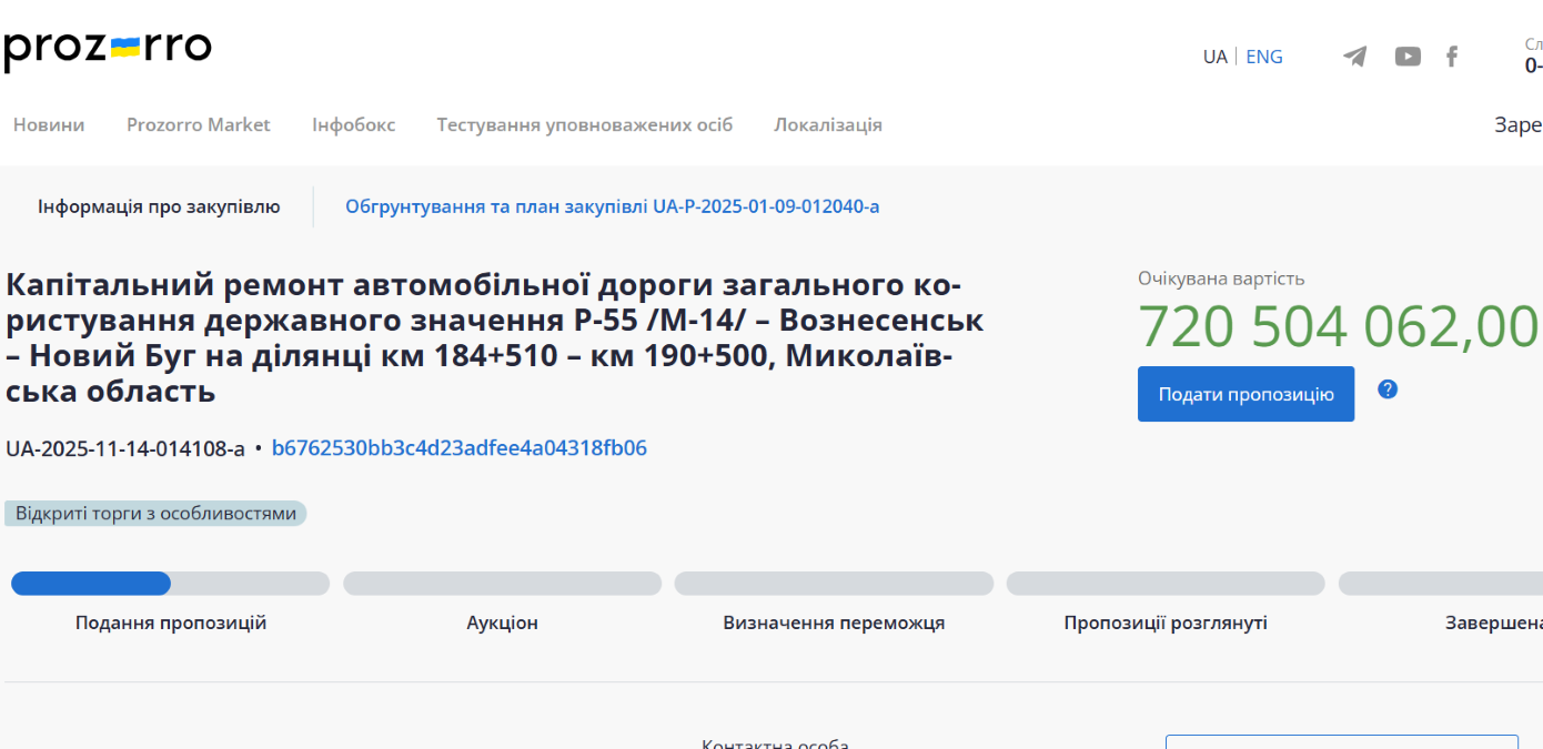 The customer is the Infrastructure Restoration and Development Service in Mykolaiv region. The expected cost of the works is over UAH 720 million including VAT.