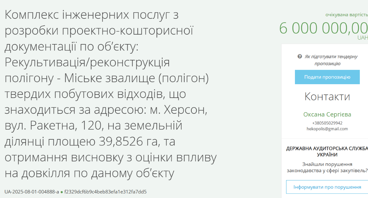 Kherson plans to spend UAH 6 million on a project to reconstruct the city's 40-hectare landfill. The contractor must not only develop the documentation but also obtain an environmental opinion by October 2026.