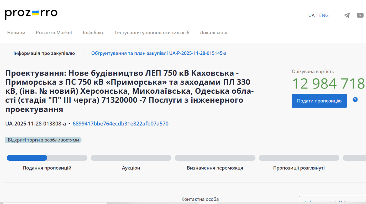 The second tender is for the third stage of designing the same facility, where the expected cost of engineering works is UAH 12.9 million.