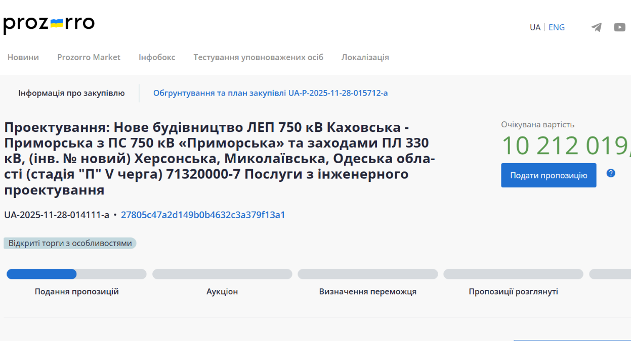 According to the tender documentation, the design of the 750 kV Kakhovska-Prymorska transmission line is a key stage in the development of the energy sector in southern Ukraine, as the new lines will ensure reliable electricity transmission and strengthen the region's energy security.