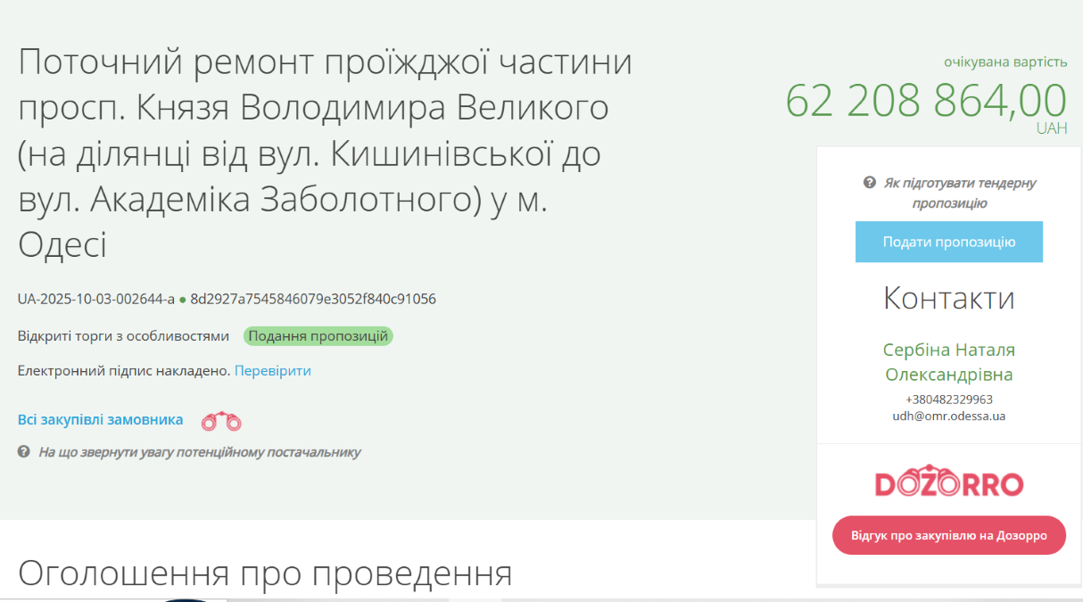 The Road Maintenance Department of Odesa City Council has announced two tenders for the repair of Prince Volodymyr the Great Avenue. These are current and overhaul repairs with a total expected cost of over UAH 143 million.