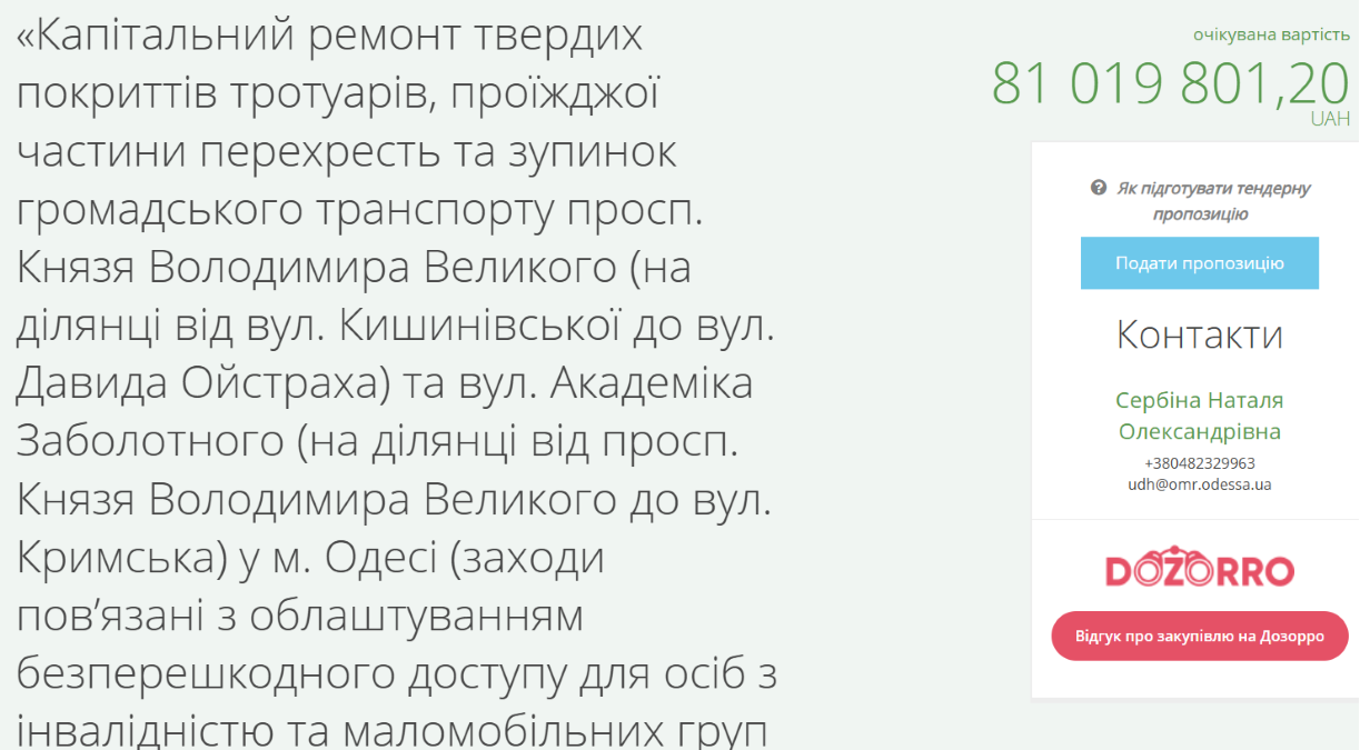 The terms of reference state that the overhaul involves the arrangement of a barrier-free environment, including ramps and convenient descents for people with limited mobility. The customer for both procurements is the Road Maintenance Department of the Odesa City Council.
