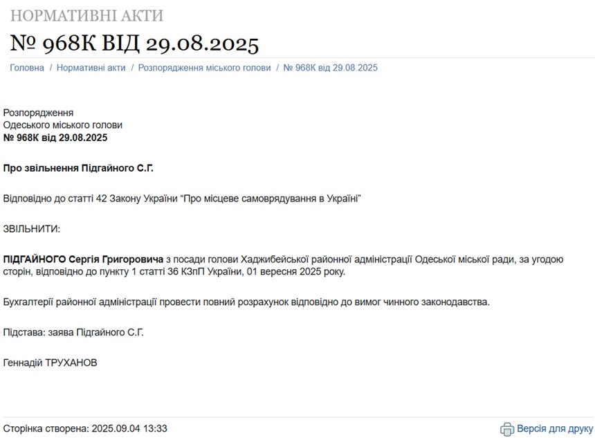 Serhiy Pidhainyi took over as head of the district administration on August 22, but the order on his appointment was published on August 26. The same was true for his dismissal, which was signed on August 29 and made public on September 4.