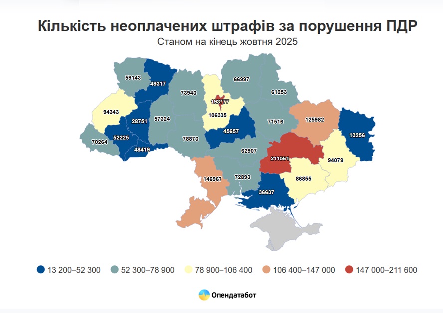 Dnipropetrovs'k region is the leader in terms of the number of unpaid fines - 211.5 thousand fines (11%). The capital follows with 193.7 thousand (10%), Odesa region is in third place with 146,967 fines (7%), Kharkiv region with 125.9 thousand (6%), and Kyiv region with 106.3 thousand (5%).