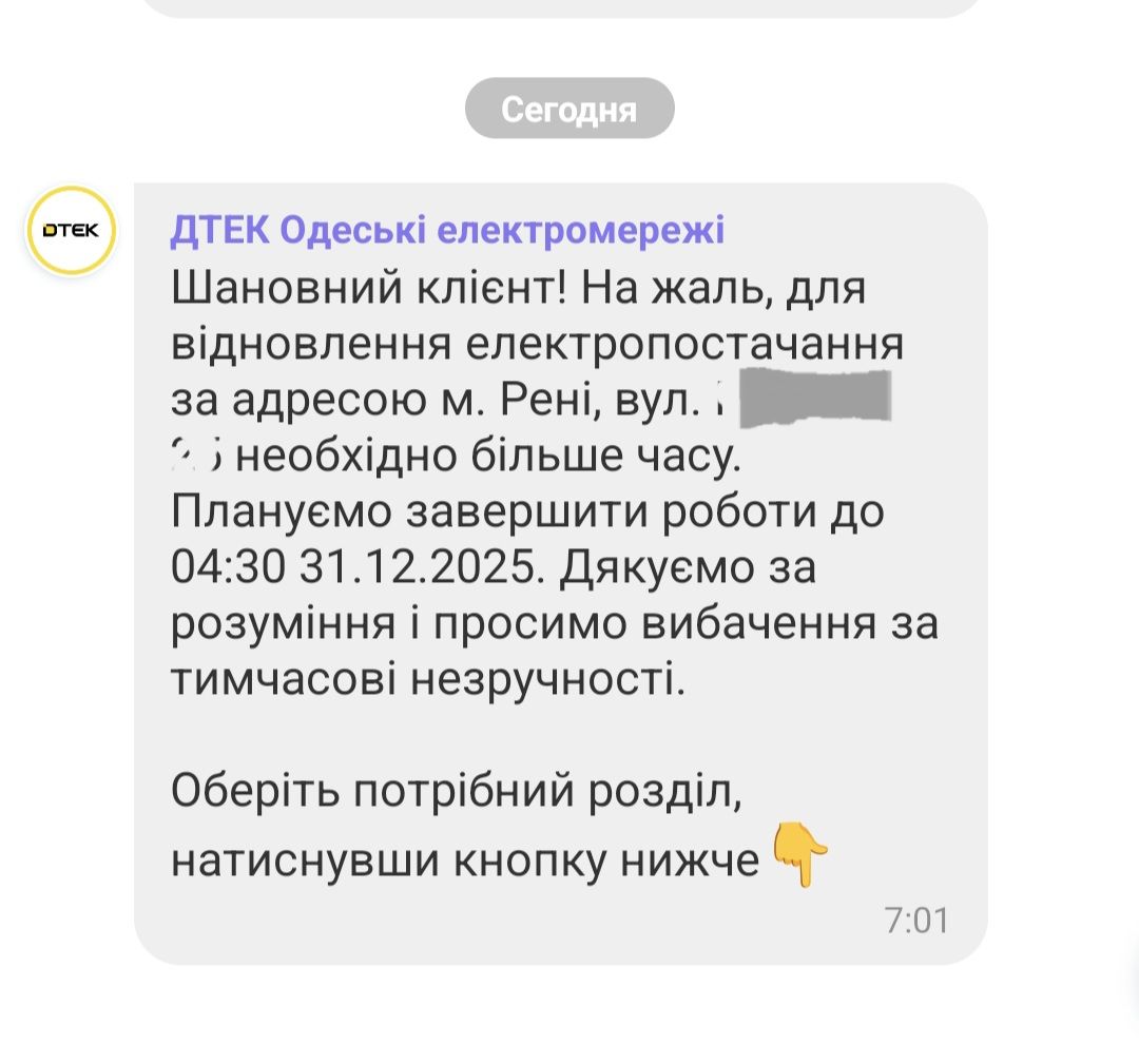 Meanwhile, DTEK Odesa Power Grids' chatbot provides information that the estimated resumption of consumption in Reni is scheduled for 4:30 a.m. on December 31, 2025.
