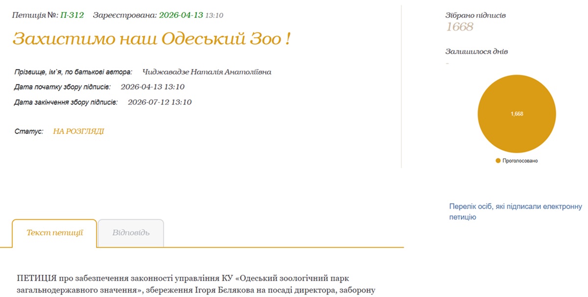 A petition to the head of the Odesa City Council demanding that Ihor Bilyakov be retained as director of the Odesa Zoo collected the 1,000 votes needed to be considered and responded to by the community in less than a day on April 16.