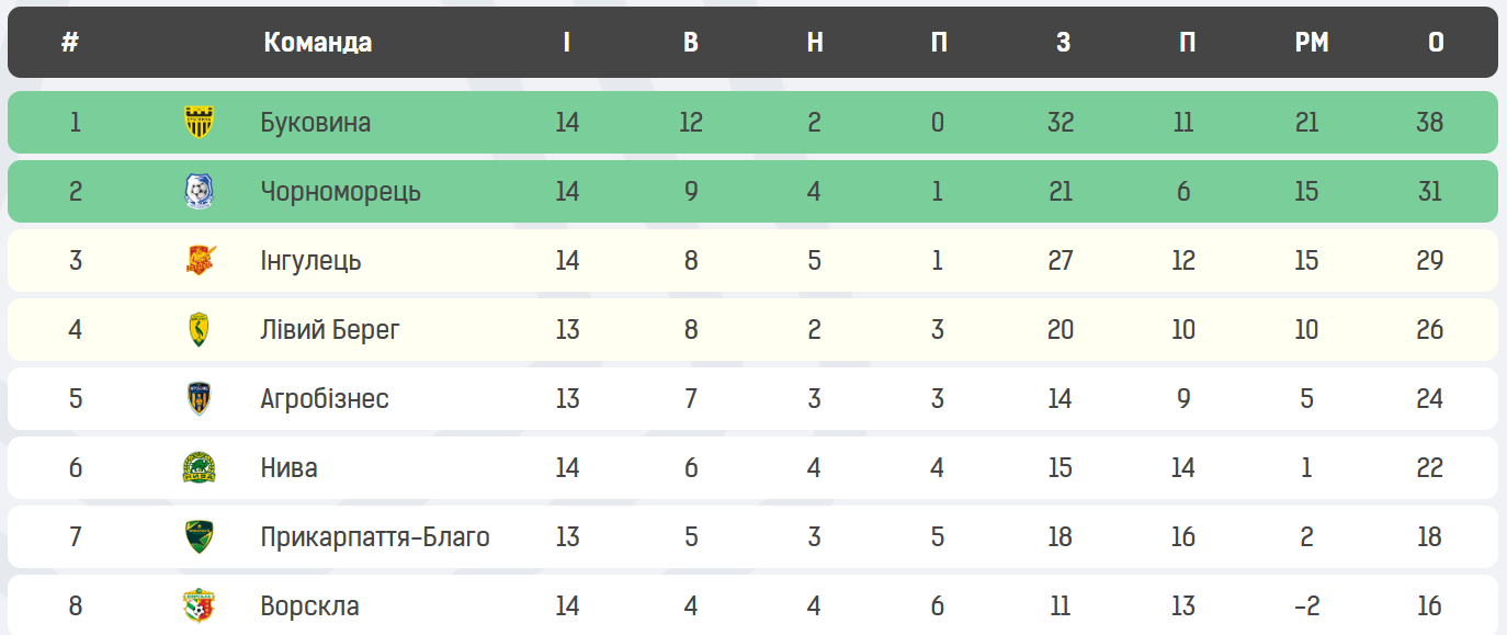- "Thanks to the victory, Bukovyna now has a 7-point lead over Odesa, who still hold second place, 2 points ahead of Ingulets.