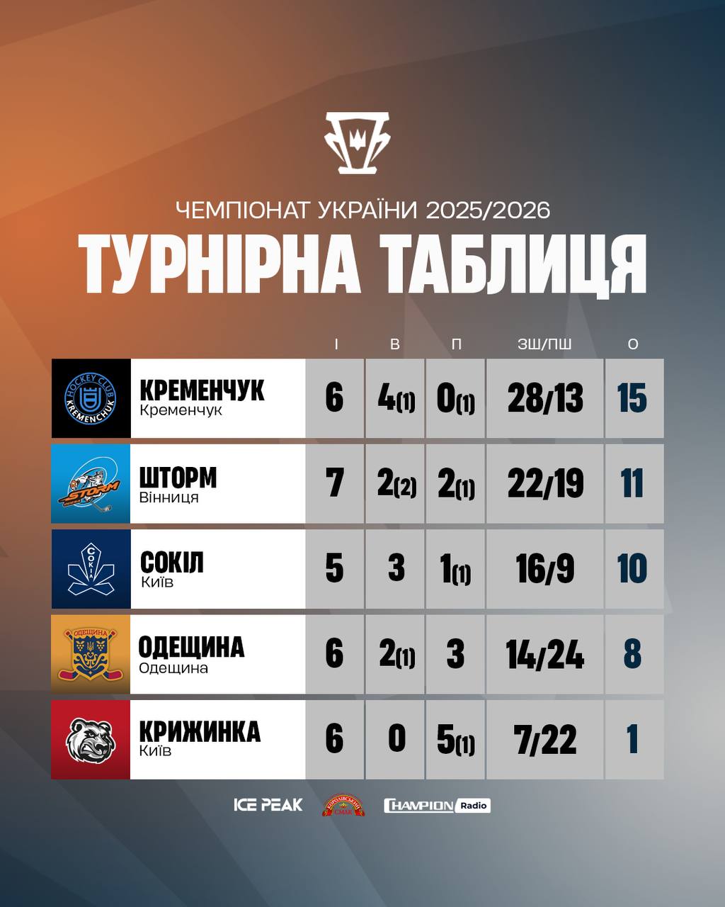 - "Odeschyna and Storm lost in tense matches to the leaders of Ukrainian hockey - HC Kremenchuk. Storm's second match was also supposed to take place this week, but instead the Odesa-Vinnytsia team won a technical victory, as Kyiv's Kryzhynka-Capitales did not show up for the game and decided to withdraw from the current championship draw.