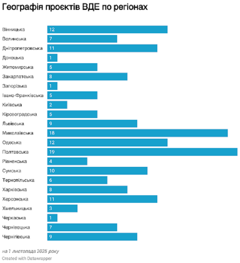 Geographically, the leaders are Poltava (19 projects) and Mykolaiv (18 projects) regions. Donetsk, Zaporizhzhia, and Cherkasy regions have only one initiative each. There are no projects in the city of Kyiv or in the occupied Luhansk region.