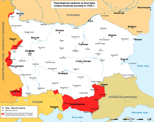 A map of Bulgaria after the signing of the Treaty of Néís in 1919. Map: Wikipedia