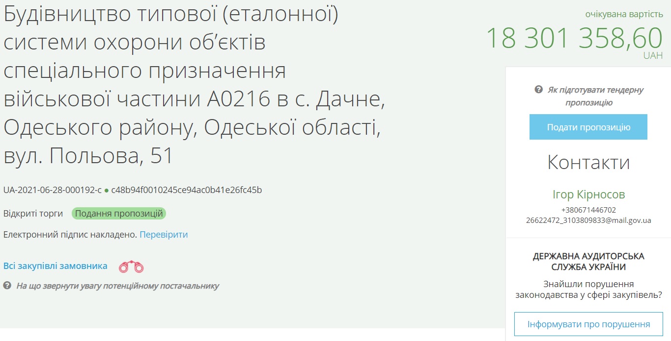 Йдеться про військову частину в селі Дачне Одеської області. Аукціон з очікуваною вартістю закупівлі у 18 мільйонів 301,3 тисячу гривень має відбутися 15 липня.