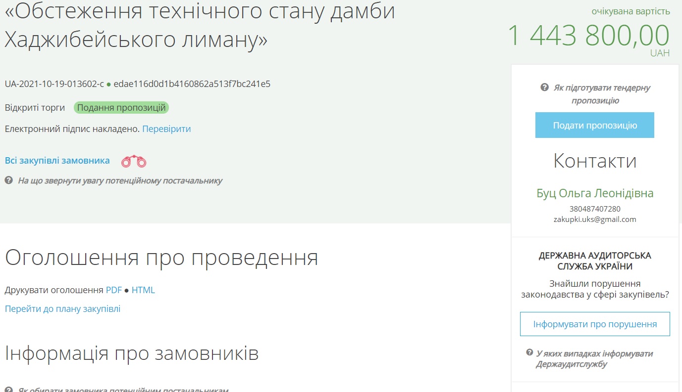 Управління капітального будівництва Одеської міської ради оголосило тендер для обрання компанії, яка обстежить технічний стан дамби Хаджибейського лиману.