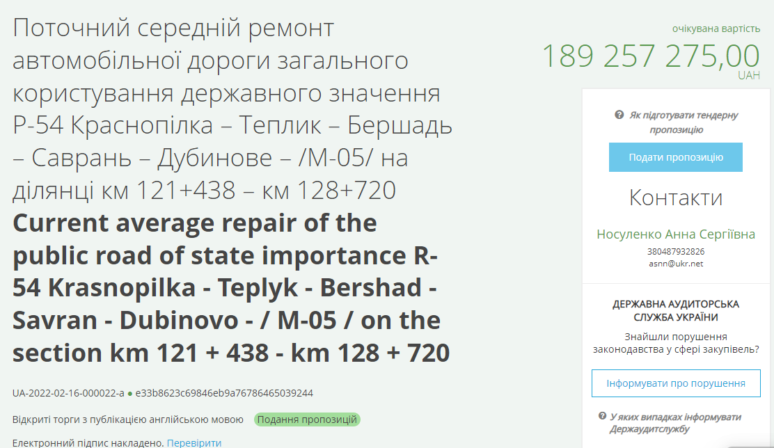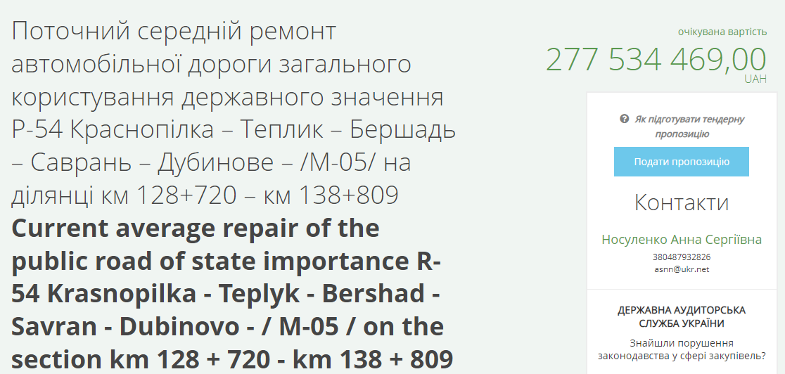 Служба автомобільних доріг в Одеській області оголосила три тендери для обрання підрядників, яким заплатять за поточний середній ремонт автомобільної дороги загального користування державного значення Р-54 Краснопілка – Теплик – Бершадь – Саврань – Дубинове – /М-05/.