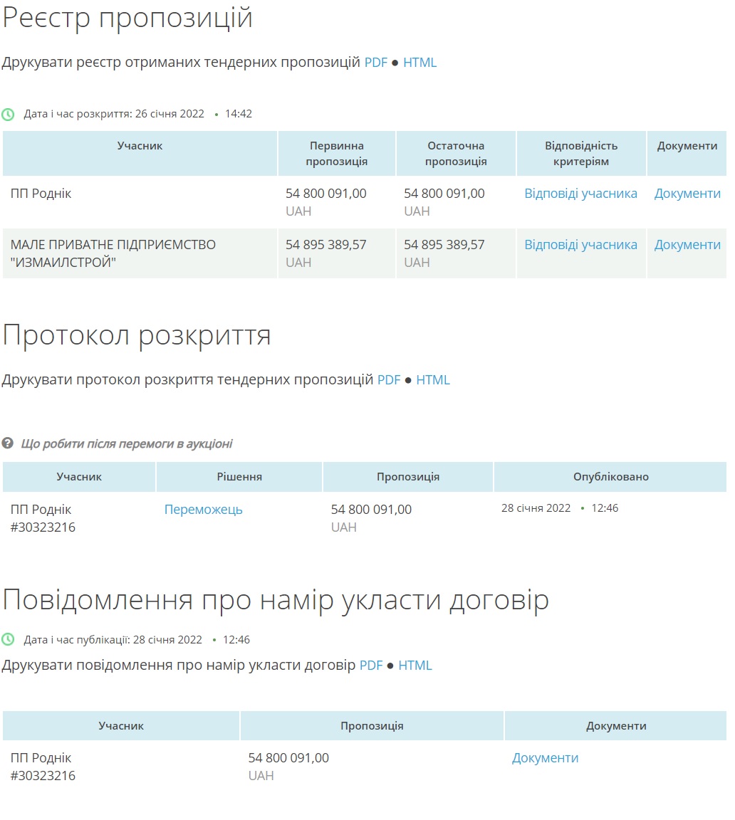 Новий аукціон із очікуваною вартістю закупівлі у 54 мільйони 897,6 тисяч гривень відбувся 26 січня 2022 року за участі приватного підприємства "Роднік" та малого приватного підприємства "Измаилстрой". Переможцем обрали "Роднік". Приватне підприємство готове працювати за 54 мільйони 800 тисяч гривень. Щоправда процедура не завершена.