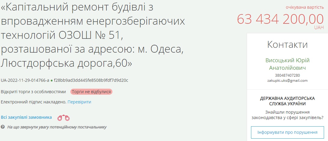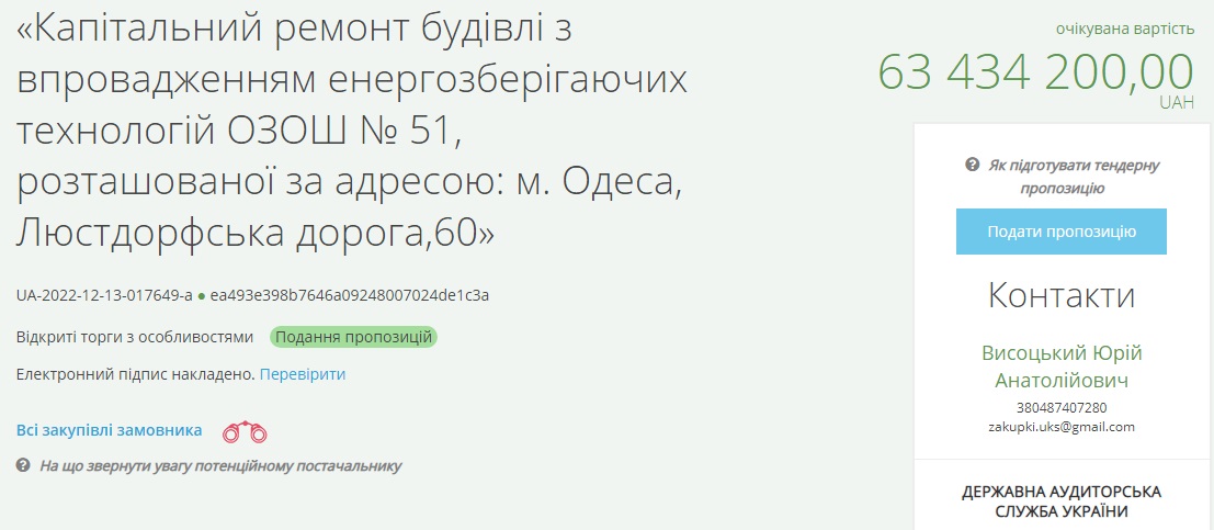 Управління капітального будівництва Одеської міської ради оголосило тендер для обрання підрядника, якому планують сплатити за капітальний ремонт будівлі з впровадженням енергозберігаючих технологій загальноосвітньої школи №51, розташованої в Одесі на Люстдорфській дорозі.