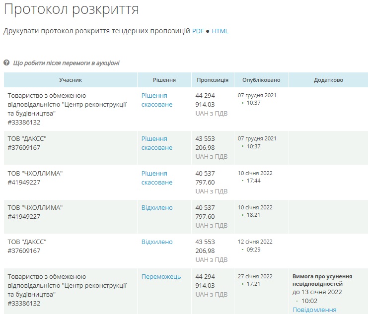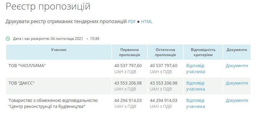 Найдешевша пропозиція була в ТОВ "Чхоллима" - 40 мільйонів 537,8 тисяч гривень, а найбільше за свої послуги просило ТОВ "Центр реконструкції та будівництва" - 44 мільйони 294,9 тисяч гривень.