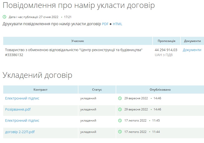 Зрештою обрали найдорожчу пропозицію ТОВ "Центр реконструкції та будівництва", з яким й уклали угоду про виконання капремонту, але згодом угоду розірвали з формулюванням "Неможливість виконання договору".