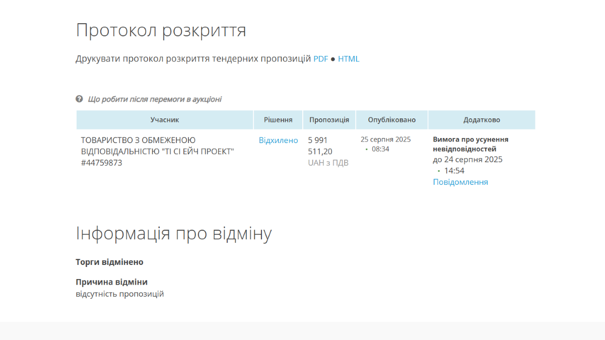 Однак учасник не зміг усунути вимоги замовника, тож його пропозицію відхилили, а тендер скасували через відсутність дійсних заявок.