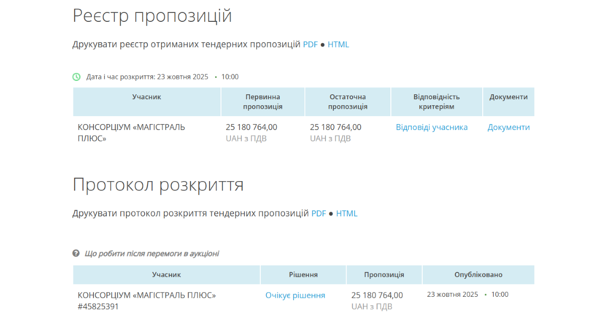 Аукціон планували провести 24 жовтня, однак він не відбувся — участь подала лише одна компанія, консорціум "Магістраль Плюс". За даними YouControl, фірму створили 6 червня 2025 року. Засновниками стали ТОВ "Будівельна компанія ВАЛК" та ТОВ "Автомагістраль-Захід". Остання пов’язана із Сергієм Юзвішиним — бізнесменом, який протягом року став власником кількох компаній, що виграли державні тендери на понад мільярд гривень.