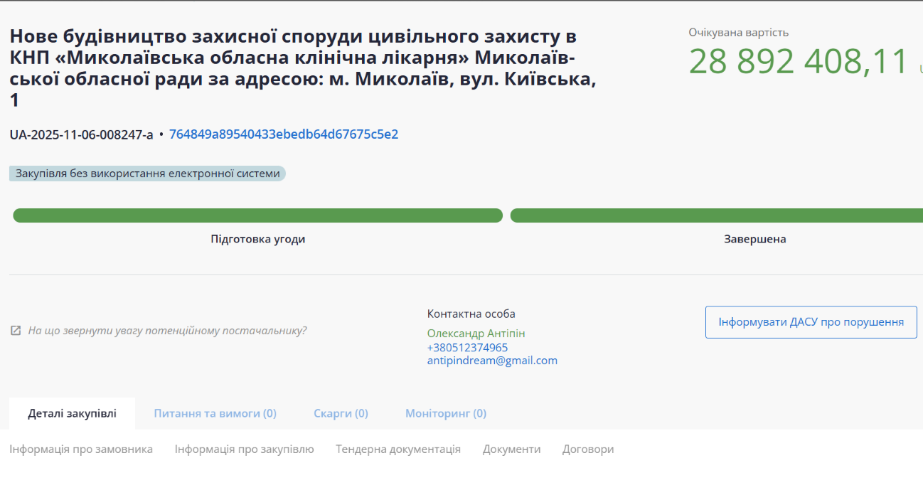 У червні 2025 року в Миколаєві провели тендер на будівництво нового укриття в обласній дитячій лікарні без аукціону. Єдиним учасником торгів стало товариство "Антарес-БУД", яке й було обране підрядником для виконання робіт на понад 62 мільйони гривень.