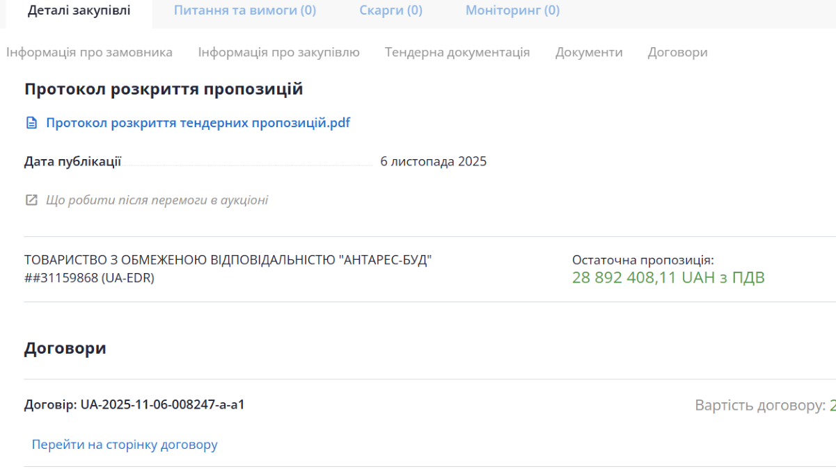 Тендер на будівництво відбувся без конкуренції, оскільки це додаткові роботи до попереднього договору, укладеного з тим самим підрядником. Переможцем стала місцева компанія ТОВ "Антарес-БУД", яка запропонувала суму, що повністю відповідає очікуваній.
