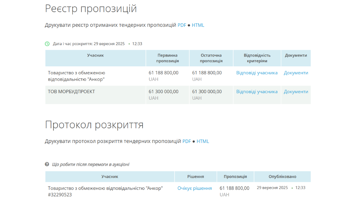 Аукціон на капітальний ремонт гідротехнічної частини причалу №9 у Чорноморському порту відбувся 29 вересня і за перемогу боролися дві компанії – ТОВ "Морбудпроект" та ТОВ "Анкор". Пропозиція останньої компанії була найменшою й склала на 200 тисяч менше очікуваної суми закупівлі.