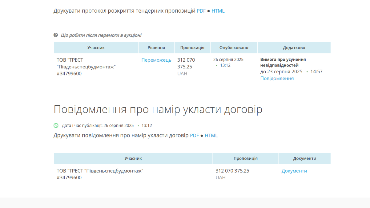 Попри це, 26 серпня "Енергоатом" підтвердив намір укласти договір з товариством. Серед документів компанії була довідка від НАЗК, яка підтвердила відсутність інформації про корупційні або пов’язані з корупцією правопорушення. У протоколі рішення замовник визначив ТОВ "ТРЕСТ "Південьспецбудмонтаж" переможцем процедури закупівлі та оголосив про намір укласти договір у системі електронних закупівель.