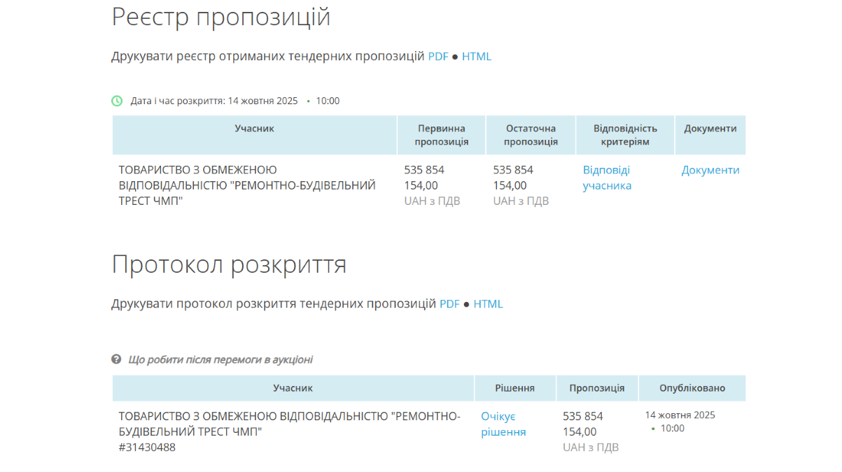 Повторний тендер оголосили 30 вересня, і цього разу пропозицію подало лише ТОВ "Ремонтно-будівельний трест ЧМП". Сума контракту виявилася лише на 4 мільйони нижчою за очікувану.