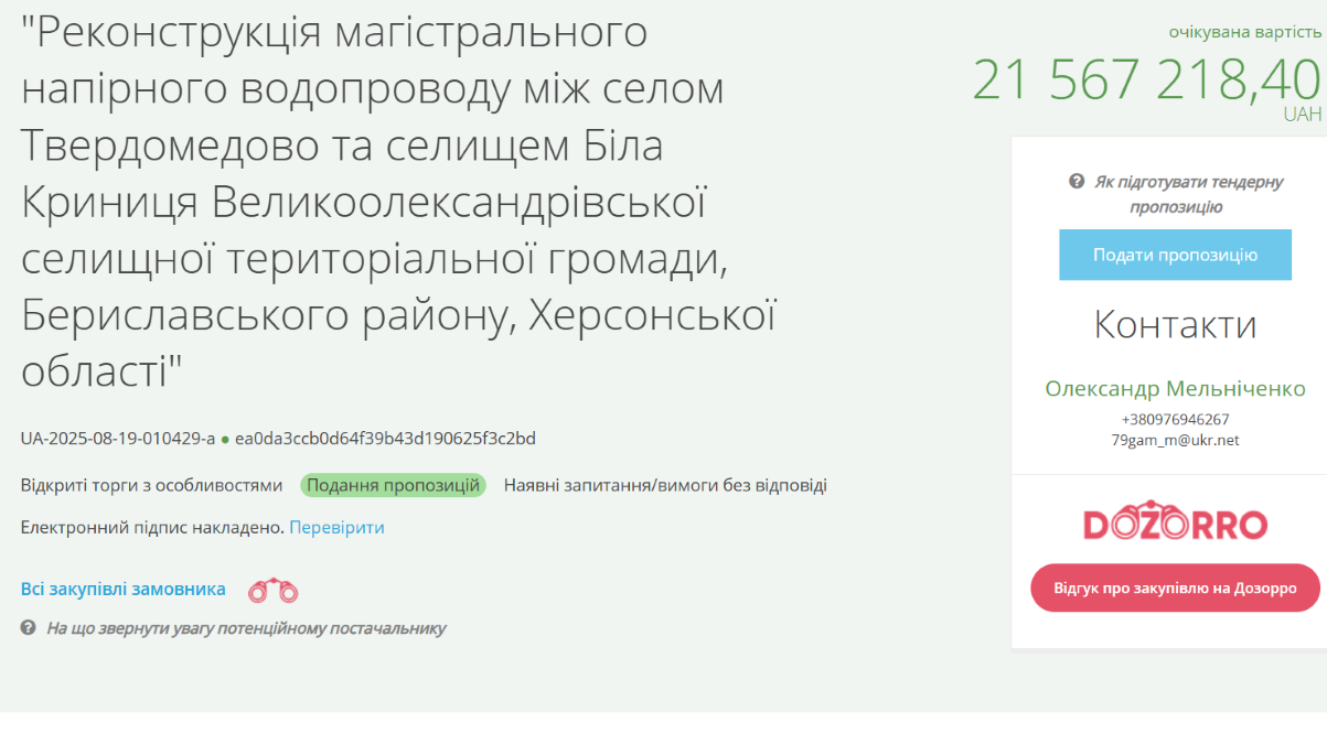 У Великоолександрівській селищній громаді Херсонської області оголосили тендер на реконструкцію магістрального напірного водопроводу між селом Твердомедове та селищем Біла Криниця. Очікувана вартість робіт становить понад 21 мільйон гривень, а завершити реконструкцію потрібно до 30 червня 2026 року.