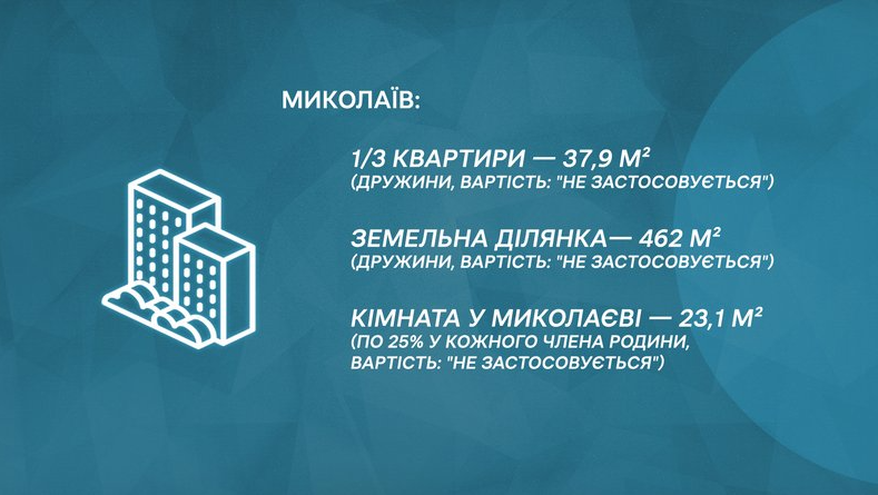Дружина заступника начальника Миколаївської ОВА В'ячеслава Базаренка, Мар'яна Карташова, з 2005 року володіє третиною квартири площею 37,9 квадратного метра в Миколаєві. Також з 2023 року вона має у власності земельну ділянку там само, площею 462 квадратні метри. Вартість обох об'єктів у декларації не зазначена.