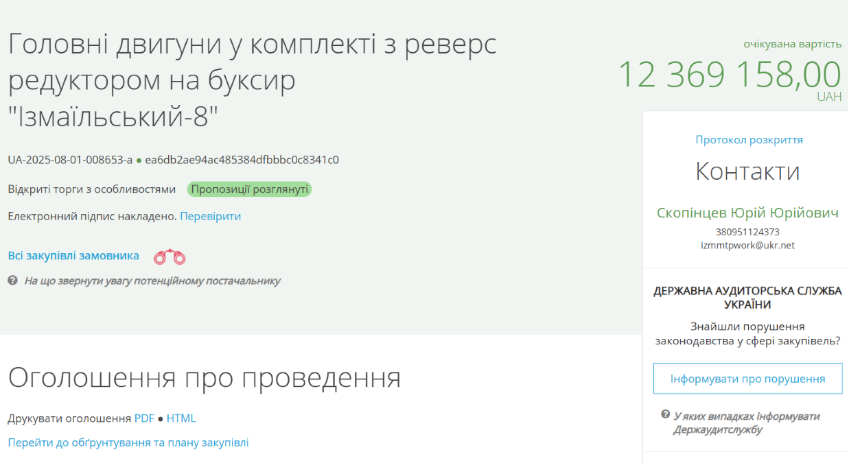 Ізмаїльський морський торговельний порт направить 11 мільйонів 994 тисячі гривень на придбання для буксира "Ізмаїльський-8" двох двигунів у комплекті з реверс-редуктором та запасні вироби до них.