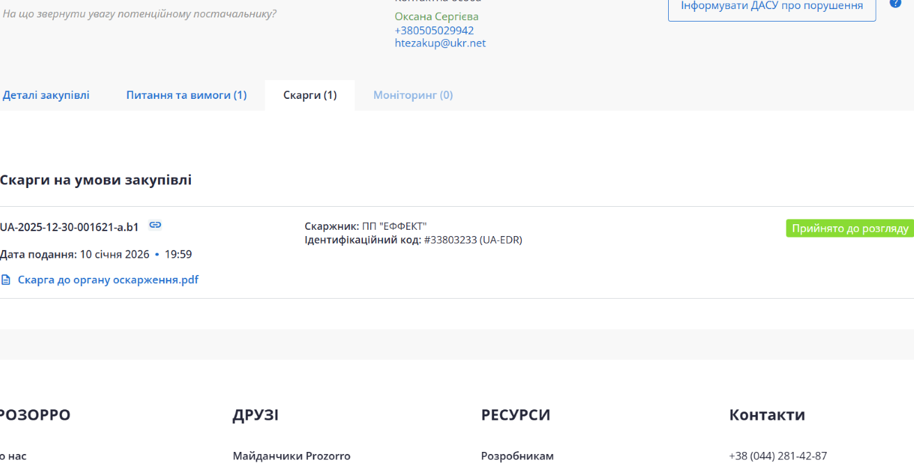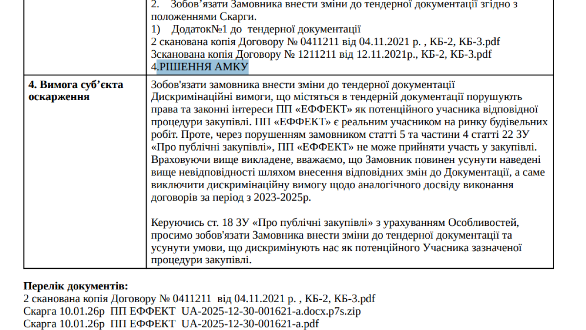 Проведення аукціону було призначено на 15 січня. Однак 9 січня один з потенційних учасників тендеру, ПП "Еффект", звернувся до замовника з проханням звернути увагу на дискримінаційну вимогу у тендерній документації. Вона стосувалася підтвердження досвіду виконання аналогічних договорів, а саме строків їх укладення – вимагалося надати договори, укладені тільки у період з 2023 по 2025 рік. Через це взяти участь у тендері могли лише ті компанії, які мали аналогічні договори саме у цей період, що обмежувало конкуренцію та ставило поза грою інших потенційних учасників.