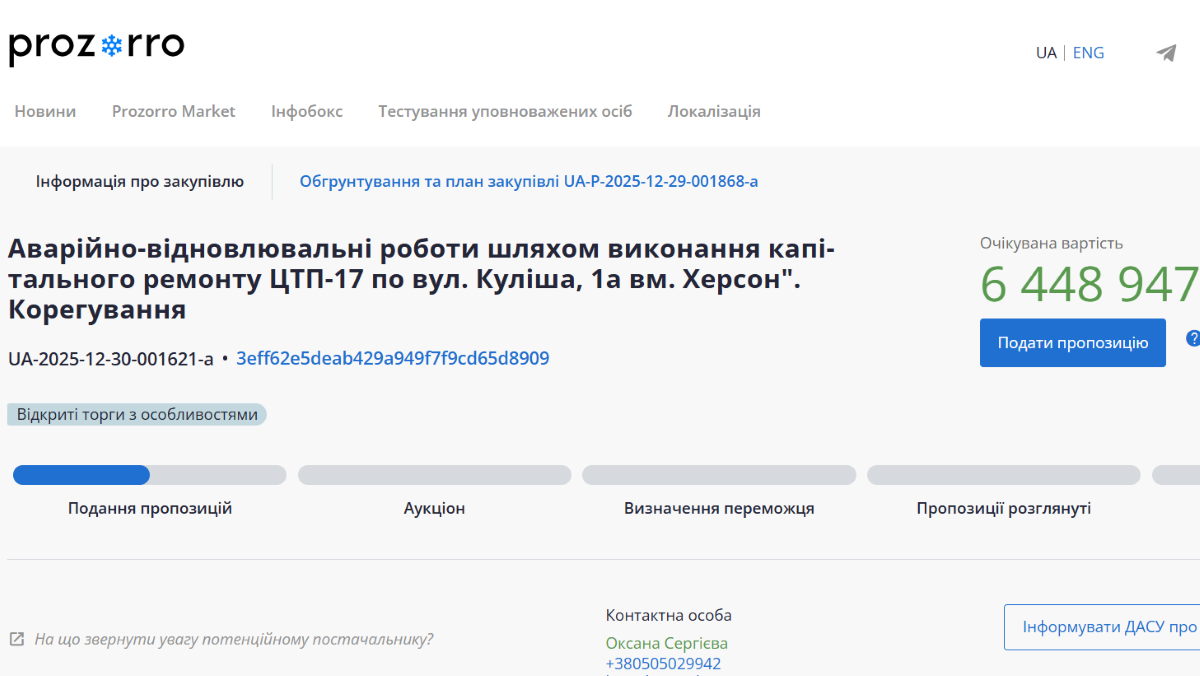 Муніципальне комунальне підприємство "Херсонтеплоенерго" оголосило тендер на аварійно-відновлювальні роботи з капітального ремонту ЦТП-17 у Херсоні. Очікувана вартість робіт становить 6,4 мільйона гривень. Виконати ремонт планують до 31 грудня 2026 року.