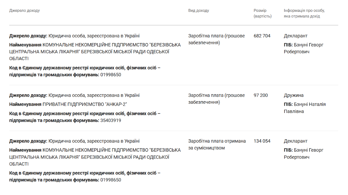 Основний дохід посадовця у 2025 році складався із заробітної плати в лікарні — 682 704 гривні. Ще 134 054 гривні він отримав за сумісництвом, працюючи лікарем-невропатологом у тому ж медзакладі. Дружина підозрюваного задекларувала 97 200 гривень зарплати, отриманої в приватному підприємстві "Анкар-2".
