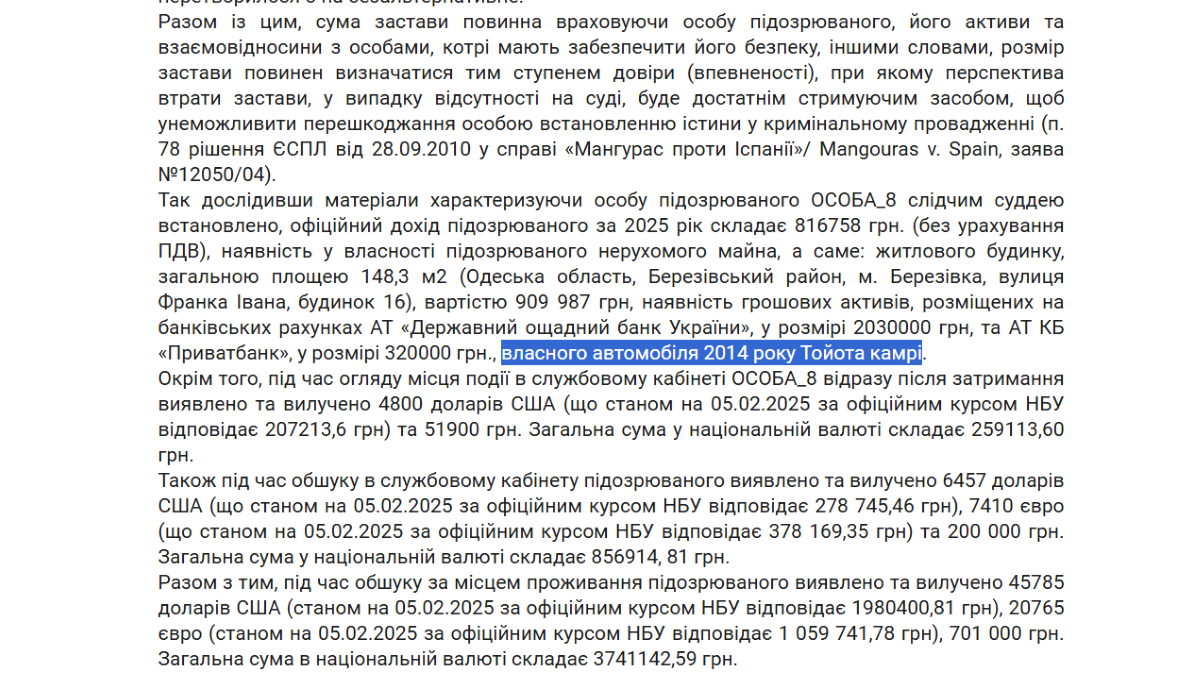 Суд звернув увагу й на офіційні доходи підозрюваного. За 2025 рік вони склали 816 758 гривень без урахування податку на доходи фізичних осіб. Також встановлено, що він володіє житловим будинком площею 148,3 квадратного метра в Березівці вартістю 909 987 гривень та автомобілем Toyota Camry 2014 року випуску.