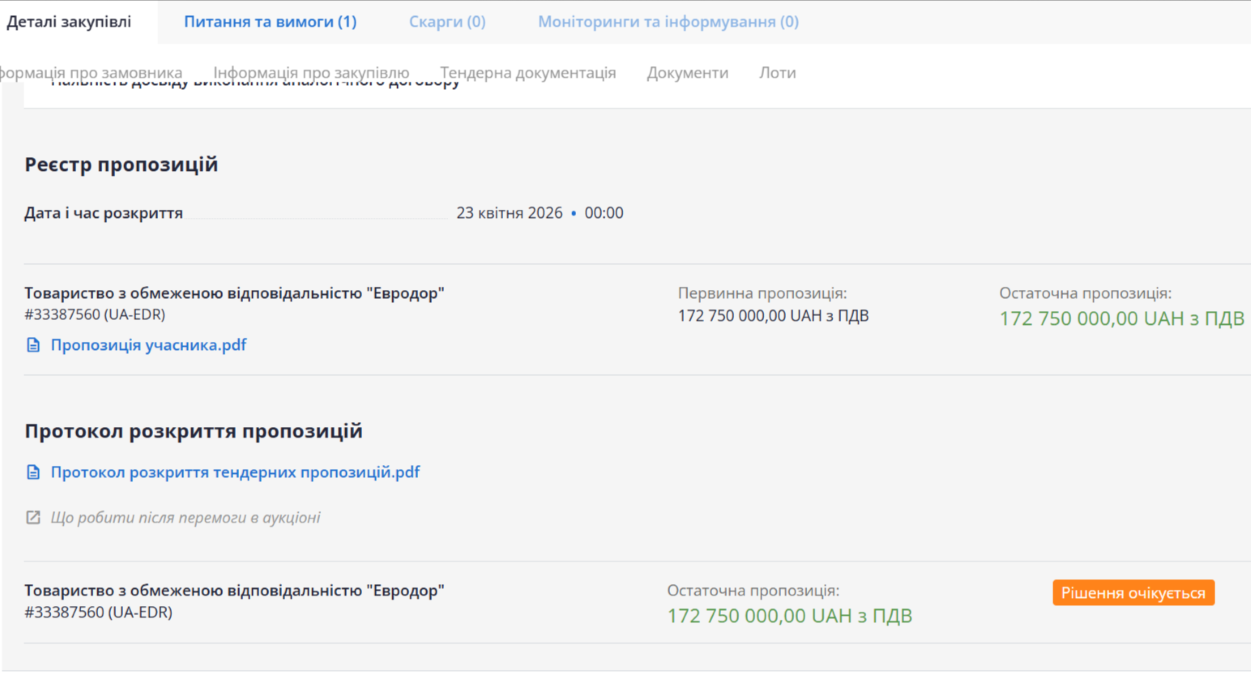 Єдиною компанією, яка подала заявку на тендер, стало ТОВ "Евродор". Пропозиція товариства склала 172,75 мільйона гривень, що дало змогу зекономити близько 800 тисяч гривень від початкової вартості. Через особливості процедури відкритих торгів відсутність конкурентів не стала перешкодою для розгляду заявки. Наразі очікується підписання договору після підтвердження підрядником наявності необхідної техніки та персоналу для виконання довгострокового проєкту.