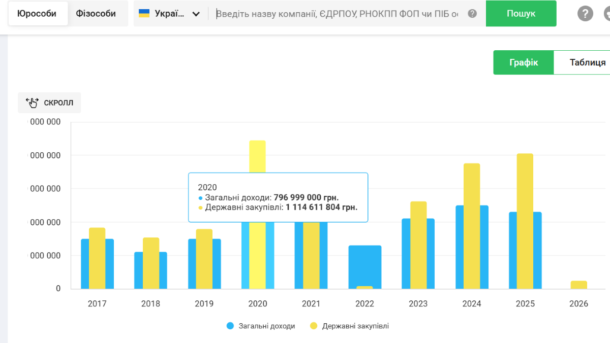Попри відносно недавню реєстрацію, фірма бере участь у державних закупівлях ще з 2017 року та загалом отримала контрактів більш ніж на 6,3 мільярда гривень. Найбільші прибутки зафіксували у 2020 році — майже 797 мільйонів гривень.
