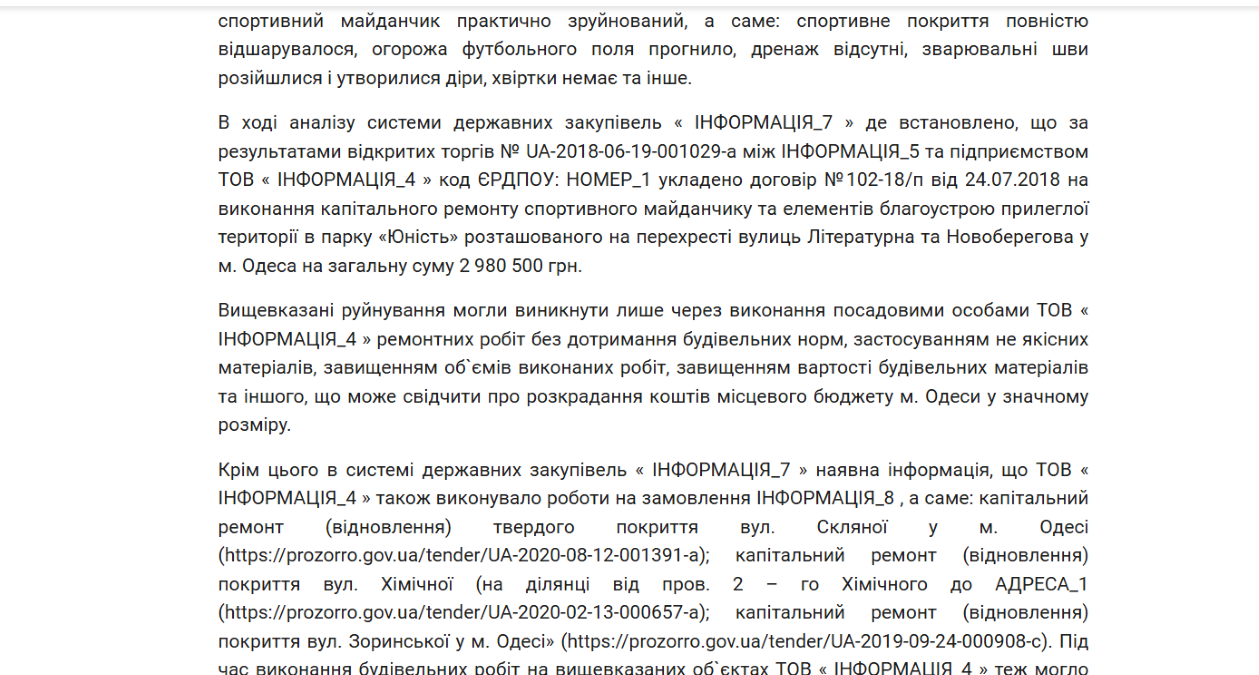 Також за ухвалою Київського районного суду м. Одеси від 2021 року, правоохоронці розслідували ще один епізод, пов’язаний із ремонтом спортивного майданчика в одеському парку "Юність". Об’єкт, відремонтований за майже 3 мільйони гривень, уже за рік опинився в аварійному стані.